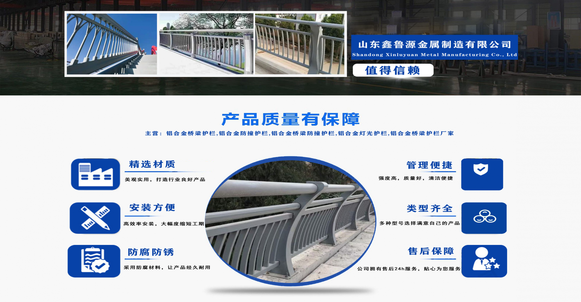 山東鑫魯源金屬制造有限公司主要經營:鋁合金橋梁護欄,鋁合金防撞護欄,鋁合金橋梁防撞護欄,鋁合金燈光護欄,不鋁合金橋梁護欄廠家,環波梁橋梁護欄,環波梁防撞護欄。質量可靠、經濟實用的顯著特點。公司為客戶提供可靠售后保障,堅持“以品質立足、服務求發展”,愿與各界朋友精誠合作、攜手發展!  服務優勢:真誠的服務理念、完善的服務體系。公司專業力量充足;工程案例眾多、從業經驗豐富;公司以可靠質量的產品,合理的價格,完善的售后服務,能夠滿足市場各個企業的需求。  企業精神:執著追求 持續創新執著追求,就是堅持不懈、堅定從容,專注于自己的事業,把能做的事情做好,不斷克服困難、把握機遇,贏得未來?! 〕掷m創新,就是生命不息、創新不止,通過持續實施技術創新、管理創新、市場創新,獲取持續的競爭優勢。...